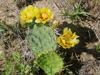 There is more sand sage prairie behind Don and Kay's house, and I climbed up their retaining wall to see what kinds of flowers were blooming on top, since it had been impossible to shoot photos of most flowers from the moving wagon on the buffalo expedition. I found many of these prickly pear cacti with golden blooms. In Oklahoma, prickly pears have a pink flower.